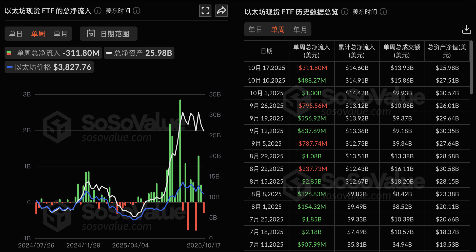 Odaily星球日报讯 根据 SoSoValue 数据,上周交易日(美东时间 10 月 13 日至 10 月 17 日)以太坊现货 ETF 单周净流出 3.12 亿美元。
