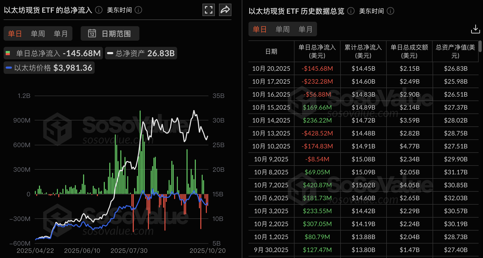 Odaily星球日报讯 根据 SoSoValue 数据,昨日(美东时间 10 月 20 日)以太坊现货 ETF 总净流出 1.46 亿美元。