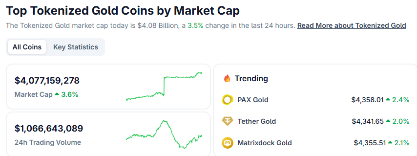 Odaily星球日报讯 据 Coingecko 数据,代币化黄金板块总市值已突破 40 亿美元,目前达到 4,077,159,278 美元,续创历史新高,24 小时涨幅 3.6%,其中 Tether Gold(XAUT)市值触及约 22.67 亿美元,PAX Gold(PAXG)市值约为 14.37 亿美元。