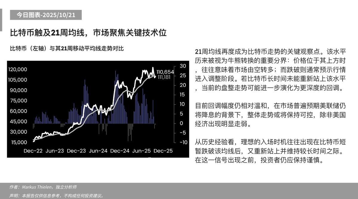 Odaily星球日报讯 Matrixport 发布今日图表称,21 周均线再度成为比特币走势的关键观察点。该水平历来被视为牛熊转换的重要分界:价格位于其上方时往往意味着市场由空转多;而跌破则通常预示行情进入调整阶段。若比特币长时间未能重新站上该水平当前的盘整走势可能进一步演化为更深度的回调。