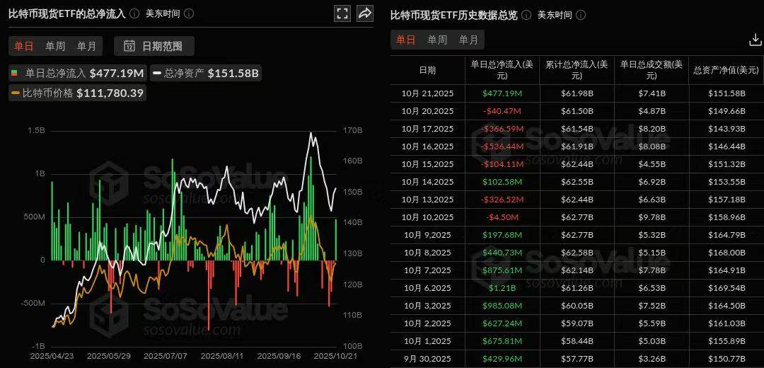 Odaily星球日报讯 根据 SoSoValue 数据,昨日(美东时间 10 月 21 日)比特币现货 ETF 总净流入 4.77 亿美元。