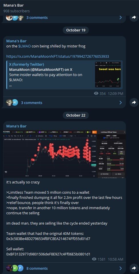 Odaily星球日报讯 据加密 KOL @ManaMoonNFT 于个人频道发文表示,Limitless 团队将 500 万枚 LTMS 代币转移至某钱包并在几小时内全部抛售,累计获利 230 万美元;就在市场以为砸盘结束后,该团队再次转入 1000 万枚代币开始砸盘。