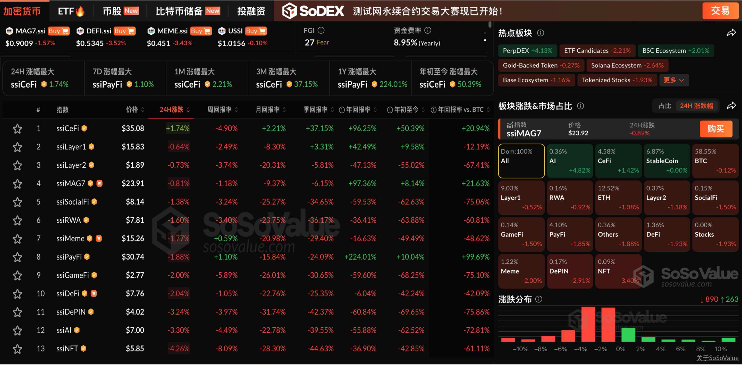 反映板块历史行情的加密板块指数显示,ssiAI、ssiLayer2、ssiSocialFi 指数分别下跌 5.72%、5.42%、3.87%。