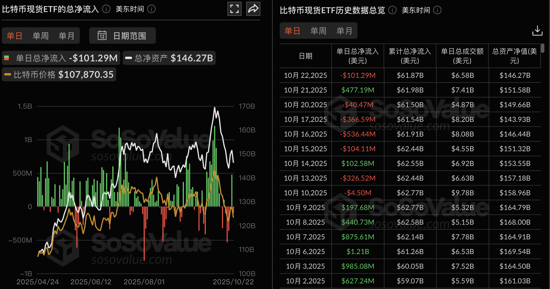 Odaily星球日报讯 根据 SoSoValue 数据,昨日(美东时间 10 月 22 日)比特币现货 ETF 总净流出 1.01 亿美元。