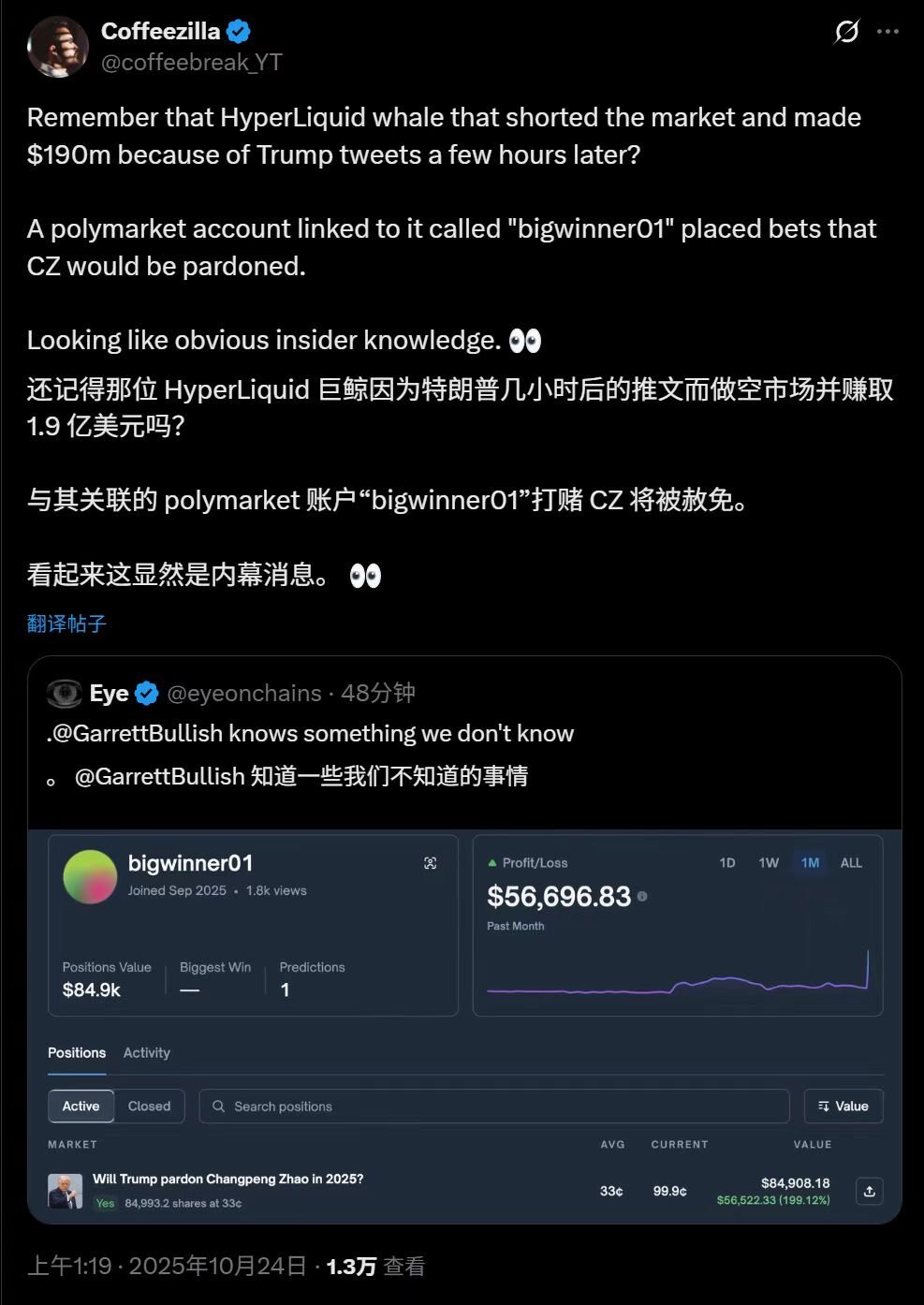Odaily星球日报讯 YouTuber 与调查记者 Coffeezilla 发文称,曾因特朗普推文提前做空并获利约 1.9 亿美元的 Hyperliquid 100%胜率巨鲸,其关联的 Polymarket 账户“bigwinner01”此前押注 CZ 将获得总统特赦。Coffeezilla 指出,该操作时间点与相关事件高度接近,疑似涉及内幕消息交易。