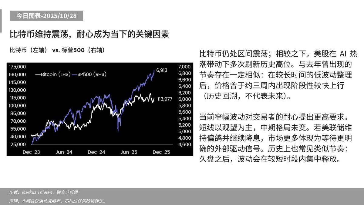Odaily星球日报讯 Matrixport 发布今日图表称,比特币仍处区间震荡;相较之下,美股在 AI 热潮带动下多次刷新历史高位。与去年曾出现的节奏存在一定相似:在较长时间的低波动整理后,价格曾于约三周内出现阶段性较快上行(历史回溯,不代表未来)。
