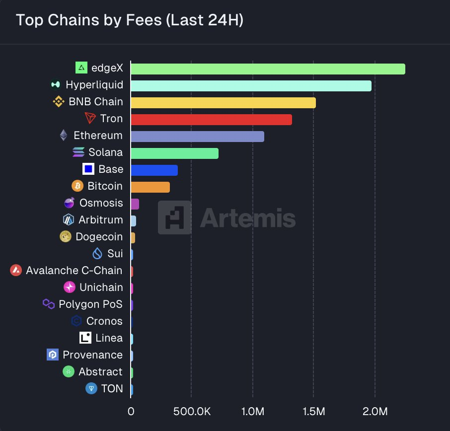 Odaily星球日报讯 Stacy Muur 在 X 平台发文表示,edgeX Exchange 的 24 小时费用收入已超过 Hyperliquid。