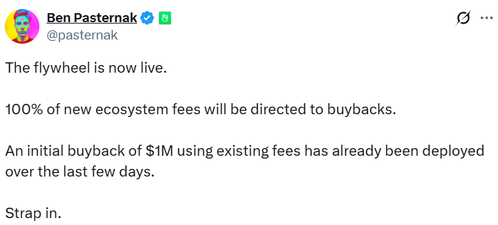 平台 100% 的新增生态系统费用将用于回购。过去几天,公司已利用现有费用进行了首轮 100 万美元的回购。