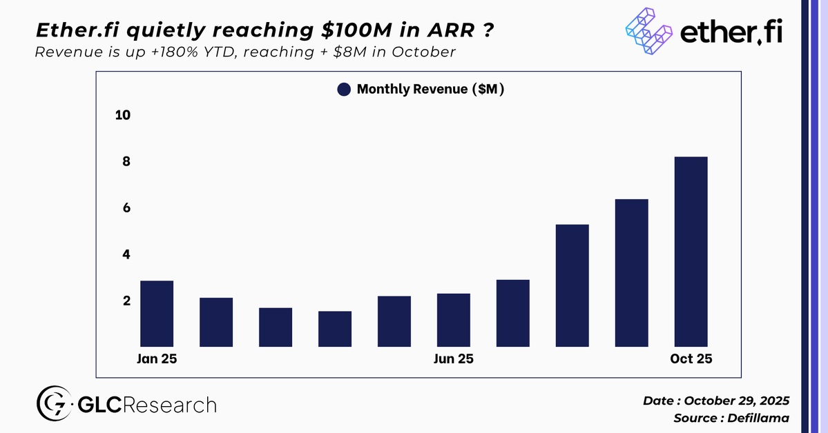 Odaily星球日报讯 GLC 在 X 平台发文表示,Ether.fi 发展势头强劲,10 月月收入已超 800 万美元,较年初增长 180%。若保持稳步增长,年经常性收入有望接近 1 亿美元。与此同时,其估值倍数正在收窄,市销率(P/S ratio)仅为 5。