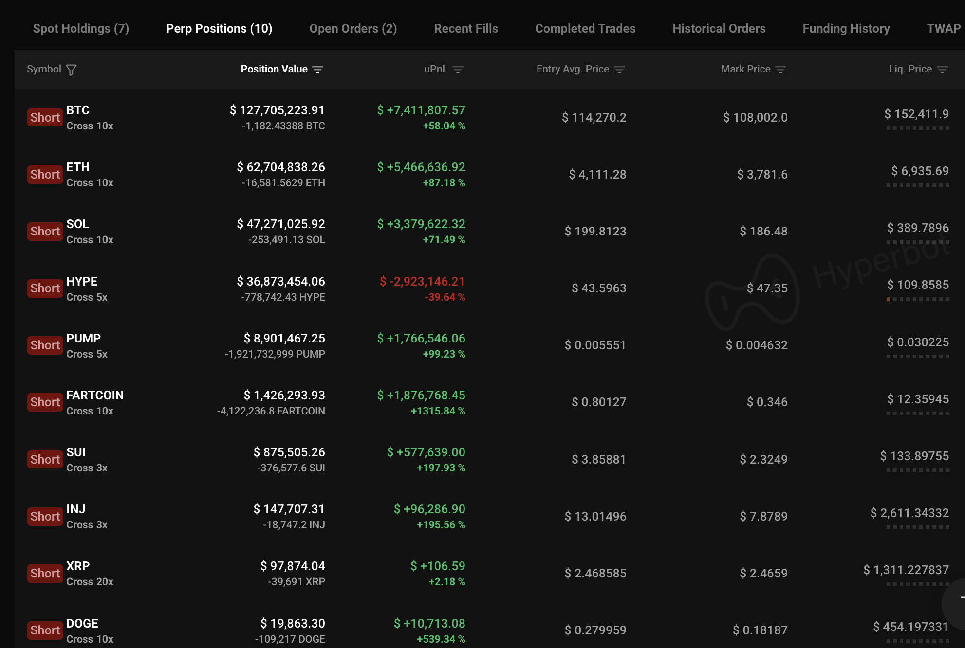 Odaily星球日报讯 Hyperbot 数据显示,某巨鲸开设了 10 种代币空单,分别为:BTC、ETH、SOL、HYPE、PUMP、FARTCOIN、SUI、INJ、XRP 和 DOGE,共计盈利超 2055 万美元,其中: