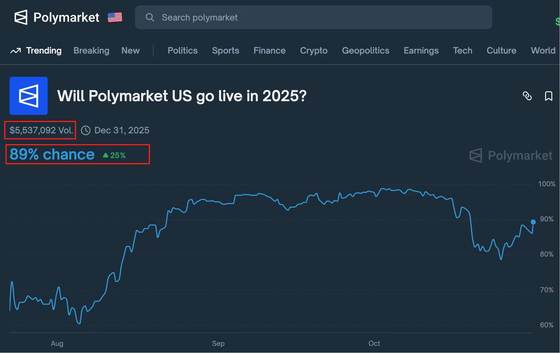 Polymarket上预测“Polymarket美国版将在2025年上线”的概率达89%