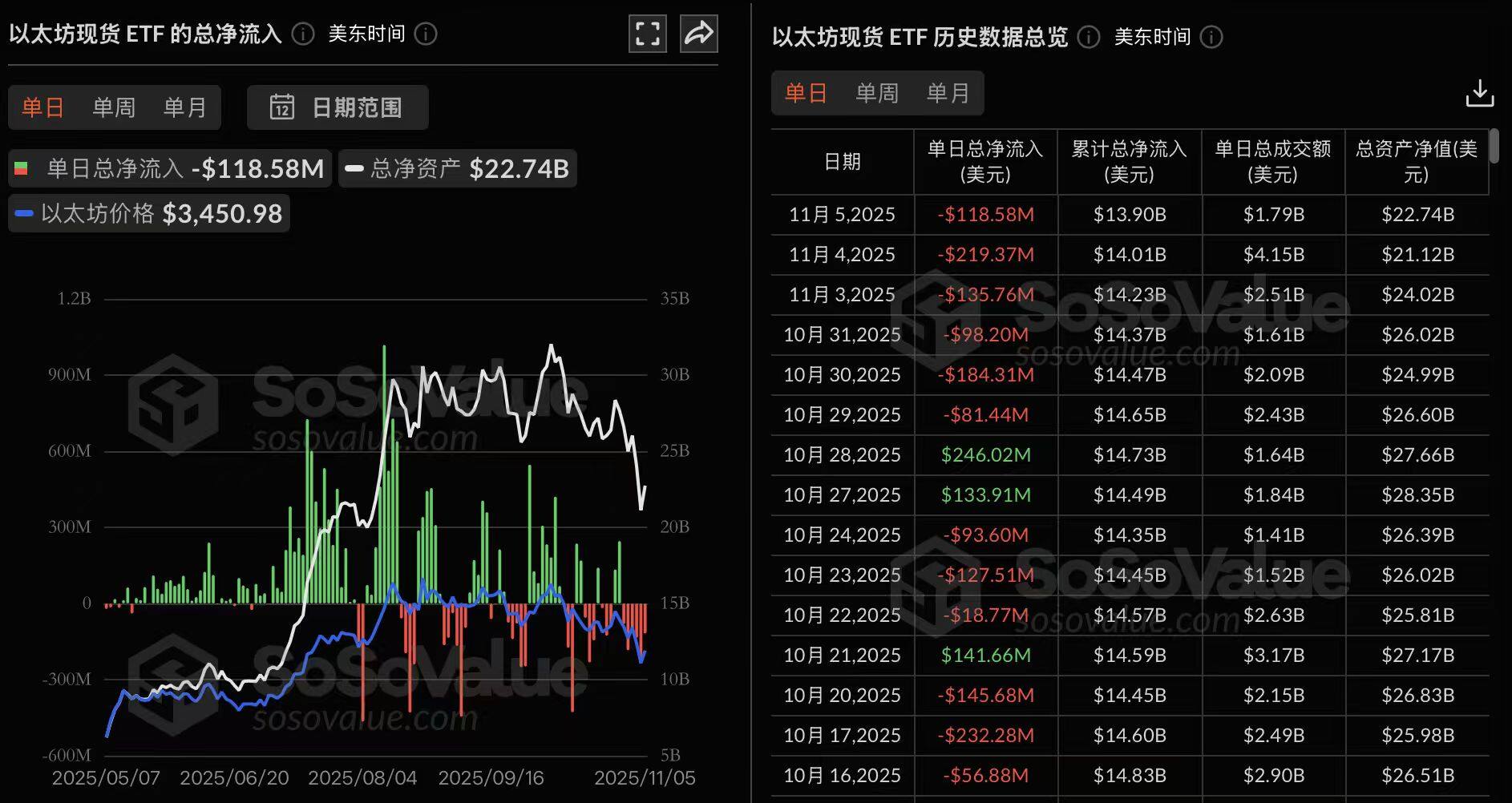 截至发稿前,以太坊现货 ETF 总资产净值为 227.38 亿美元,ETF 净资产比率(市值较以太坊总市值占比)达 5.46%,历史累计净流入已达 138.95 亿美元。