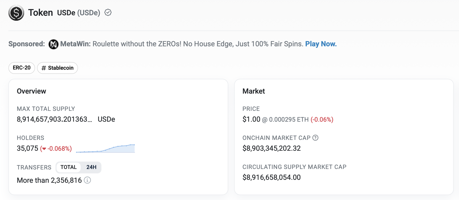 Odaily星球日报讯 Ethena 旗下稳定币 USDe 的发行规模已回落至 90 亿枚下方,暂报 89.15 亿枚,较峰值时的近 148.4 亿枚已缩水近 60 亿枚。