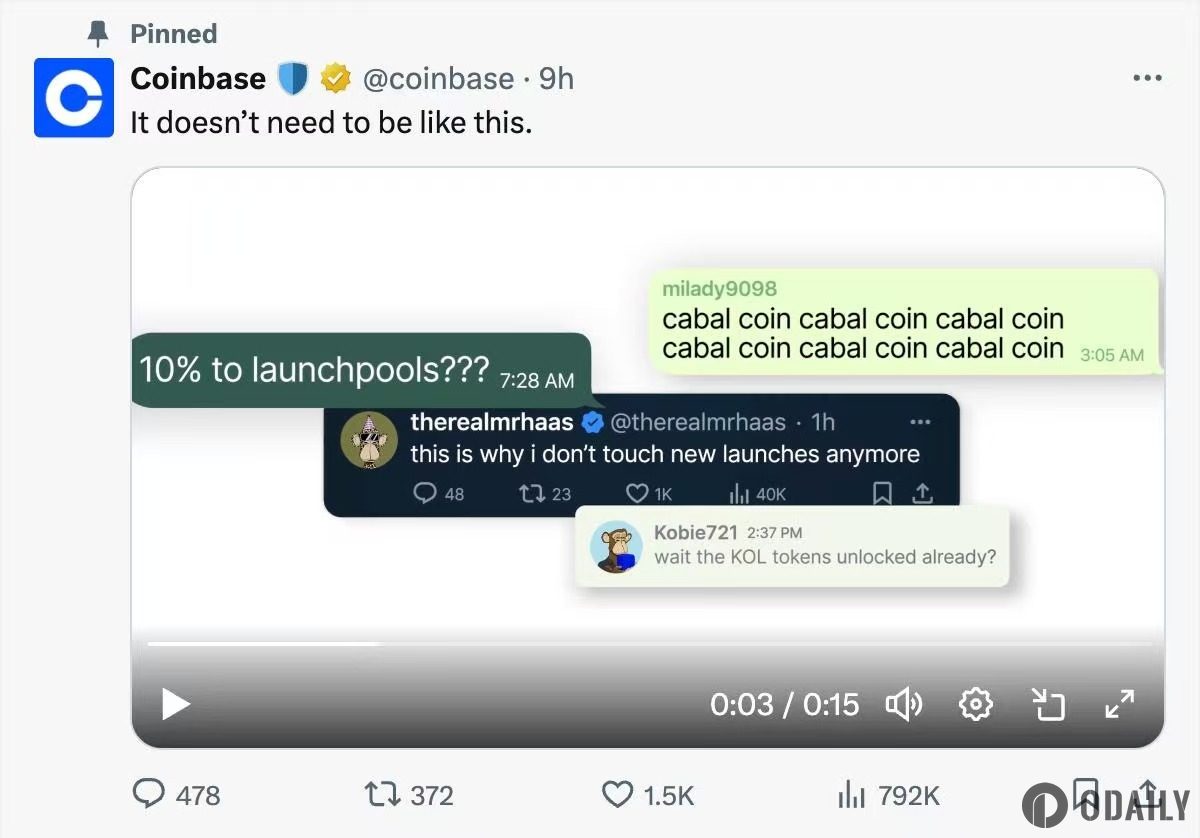 Odaily星球日报讯 Coinbase 官方于 X 平台发布视频并配文:“它不必如此。”据视频内容及评论区信息,或暗示将于 11 月 10 日推出旗下 Launchpad 平台。
