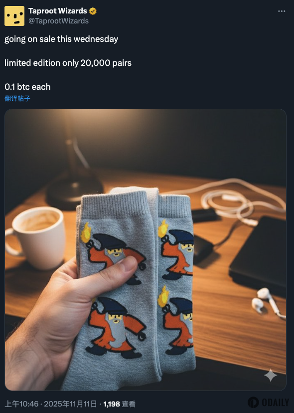 比特币NFT项目Taproot Wizards推出限量版袜子,售价0.1BTC