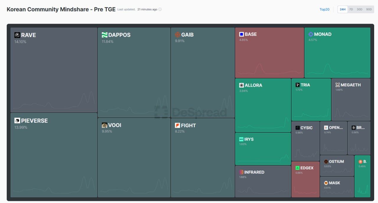 Odaily星球日报讯 据 despreadlabs 平台信息,RaveDAO 项目登上“韩国社区关注度-Pre TGE”热搜榜第一。RaveDAO 将于北京时间今晚 19:11 (11 月 11 日 11:11 am UTC)正式开启创世会员卡(Genesis Membership)铸造。用户可通过铸造会员卡获取可兑换为 RAVE 代币的 RAVE 积分,参与抽奖,奖品包括 RAVE 空投,tomorrowland 双人机票门票套装等。
