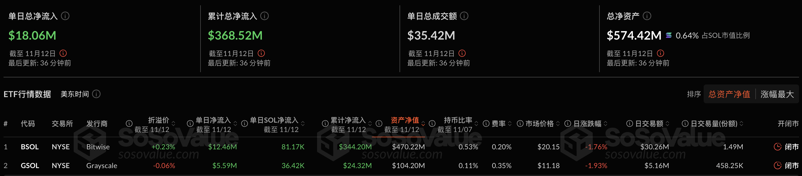 截至发稿前,Solana 现货 ETF 总资产净值为 5.74 亿美元,Solana 净资产比率达 0.64%,历史累计净流入已达 3.69 亿美元。