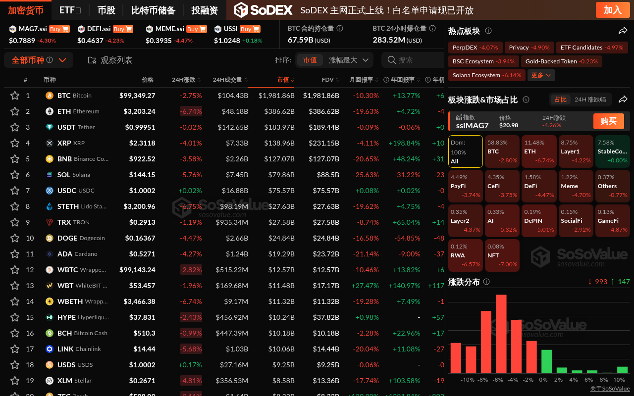 反映板块历史行情的加密板块指数显示,ssiPayFi、ssiCeFi、ssiMeme 分别下跌 4.13%、4.14%、4.83%。