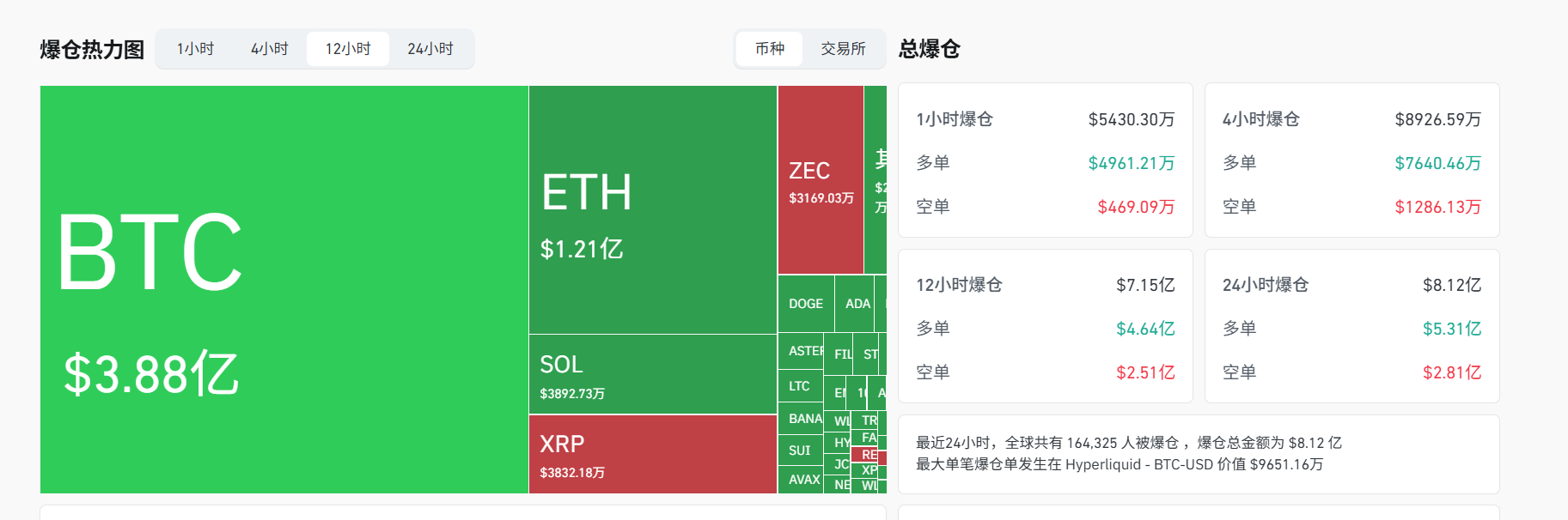 过去12小时总爆仓约7.15亿美元,其中SOL爆仓3892万