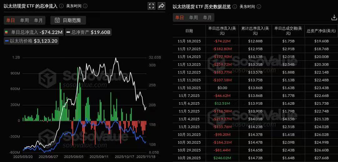 截至发稿前,以太坊现货 ETF 总资产净值为 195.96 亿美元,ETF 净资产比率(市值较以太坊总市值占比)达 5.2%,历史累计净流入已达 128.75 亿美元。