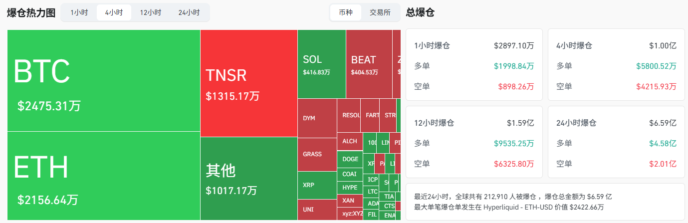 Odaily星球日报讯 Coinglass 数据显示,过去 4 小时全网爆仓 1 亿美元,其中多单爆仓 5800 万美元,空单 4215 万美元,此外 TNSR 爆仓 1315 万美元。