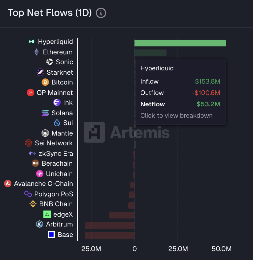 Odaily星球日报讯 Artemis 数据显示,Hyperliquid 在过去 24 小时资金净流入超 5300 万美元,位列第一。