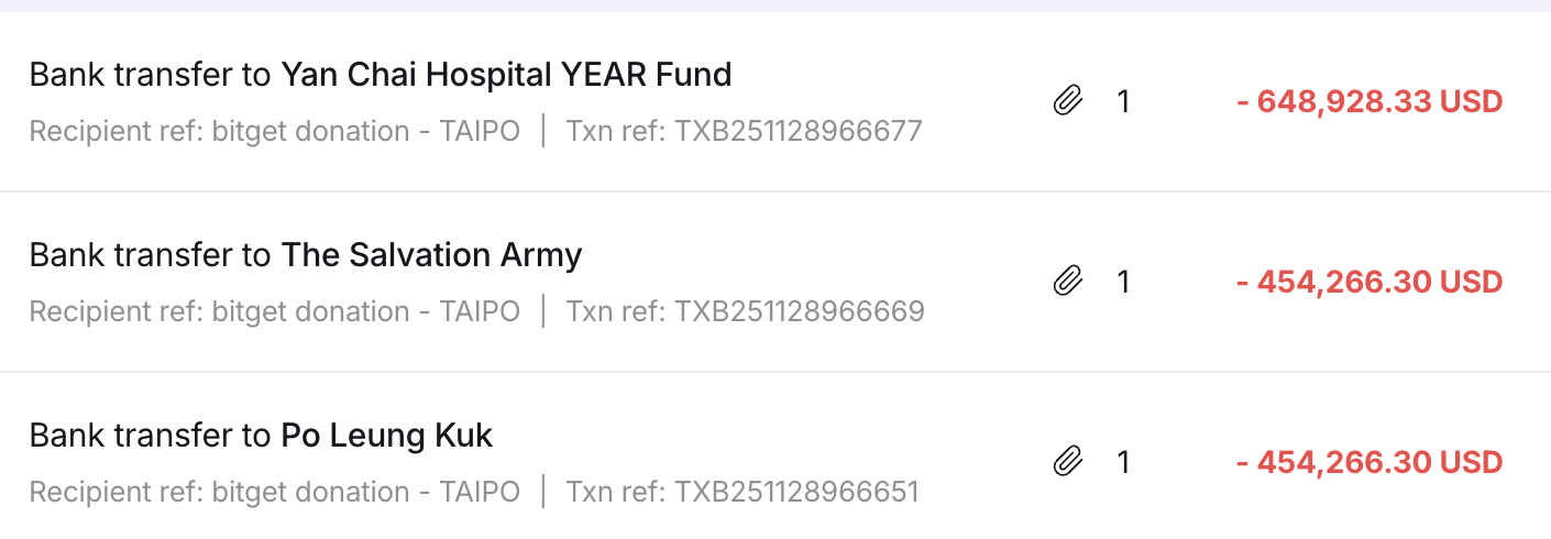 Odaily星球日报讯 此前,Bitget 宣布向香港提供总额 1,200 万港元的捐助,用于支持大埔宏福苑火灾的紧急救援、受灾家庭援助及灾后重建等多项工作。捐款将由三家具有公信力的本地公益机构分别承接与执行。