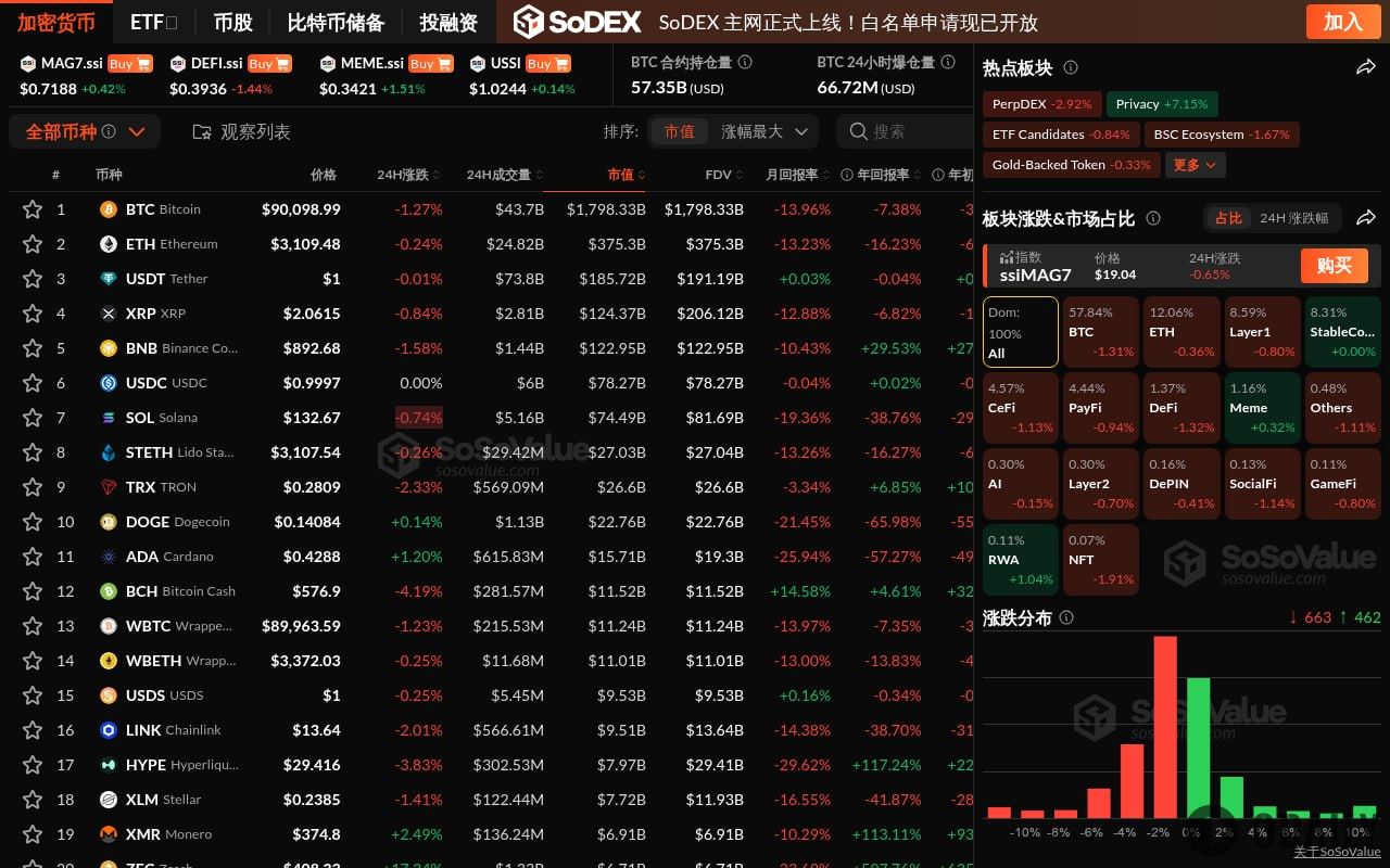 Odaily星球日报讯 12 月 9 日,根据 SoSoValue 数据,加密市场整体震荡下行,Bitcoin(BTC)下跌 1.31%,跌至 9 万美元附近。Ethereum(ETH)下跌 0.36%,跌至 3100 美元。仅 RWA 及 Meme 板块相对坚挺,分别上涨 1.04%、0.32%,RWA 板块内,Ondo Finance(ONDO)、Creditcoin(CTC)分别上涨 2.91%、6.30%,Plume(PLUME)受上线 Coinbase 等因素影响,大幅上涨 8.35%;Meme 板块内,Pepe(PEPE)、FLOKI 分别上涨 3.78%、5.29%。