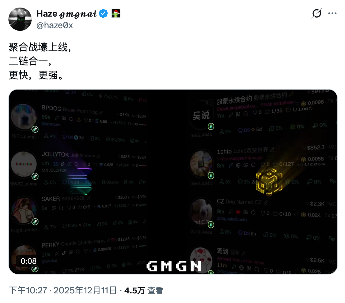 Odaily星球日报讯 GMGN 创始人 Haze 于 X 宣布,“聚合战壕”功能已上线,支持 Solana 与 BSC 同时扫链。