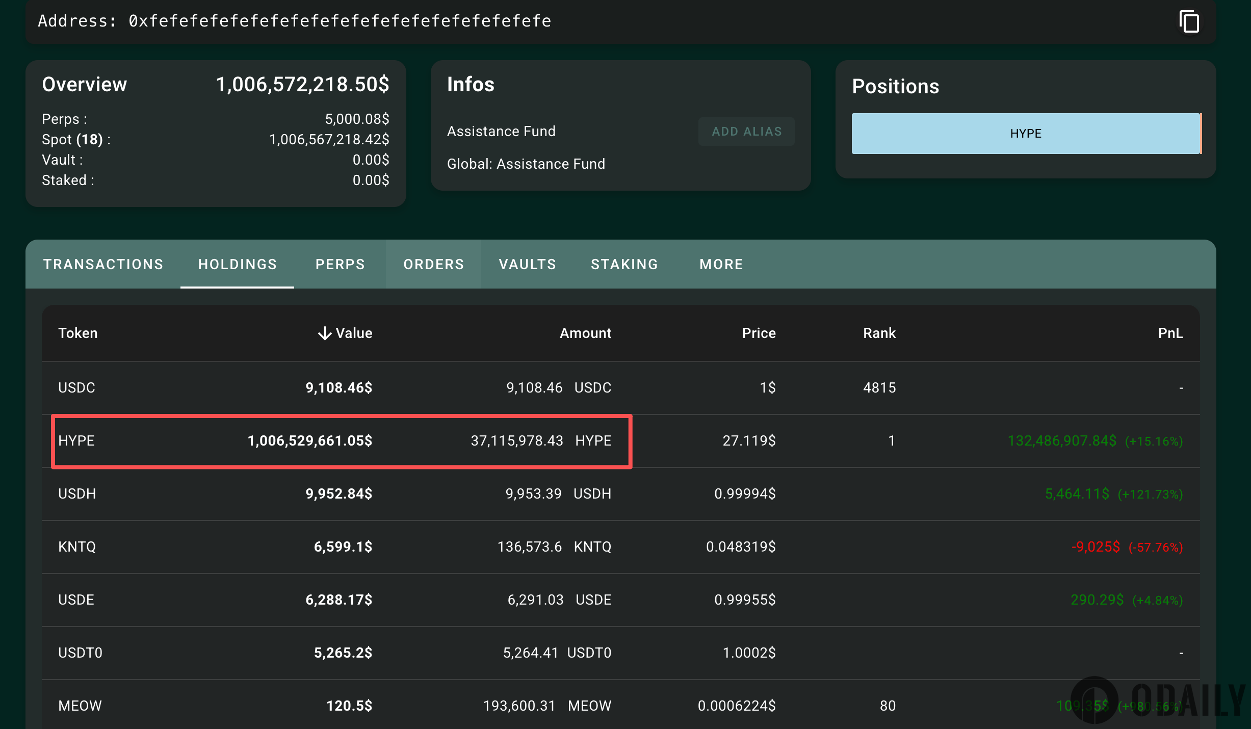 Odaily星球日报讯 链上数据显示,目前 Hyperliquid 的 Assistance Fund 地址中持有 37114029 枚 HYPE,对应价值约 10.1 亿美元。若 Hyperliquid 基金会的销毁提案通过,将使 HYPE 的流通供应量减少 13%。