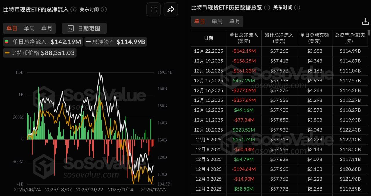 Odaily星球日报讯 根据 SoSoValue 数据,昨日(美东时间 12 月 22 日)比特币现货 ETF 总净流出 1.42 亿美元。