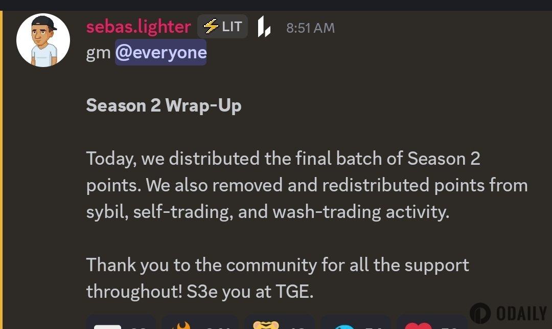 Odaily星球日报讯 Lighter 官方人员于 Discord 社区内发言表示:“今天我们已经发放了第二季的最后一批积分。同时,我们也移除了并重新分配了来自女巫行为(sybil)、自成交(self-trading) 以及刷量交易(wash-trading) 的积分。”