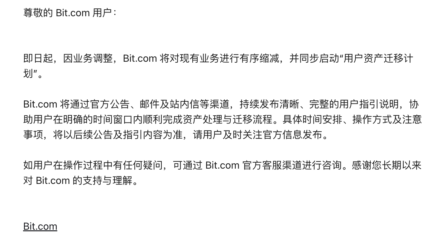 Bit.com 将通过官方公告、邮件及站内信等渠道,持续发布清晰、完整的用户指引说明,协助用户在明确的时间窗口内完成资产处理与迁移流程。具体时间安排、操作方式及注意事项,将以后续公告及指引内容为准。