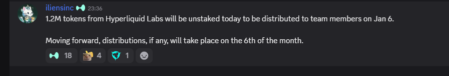 Hyperliquid澄清团队代币解锁安排:1月6日将解锁120万枚HYPE