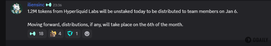 Odaily星球日报讯 Hyperliquid 在 Discord 发布说明称,已对团队代币归属与解锁时间表作出澄清。根据披露信息,团队将于 1 月 6 日解锁 120 万枚 HYPE,后续如有进一步解锁,均将在此后每个月的 6 日进行。