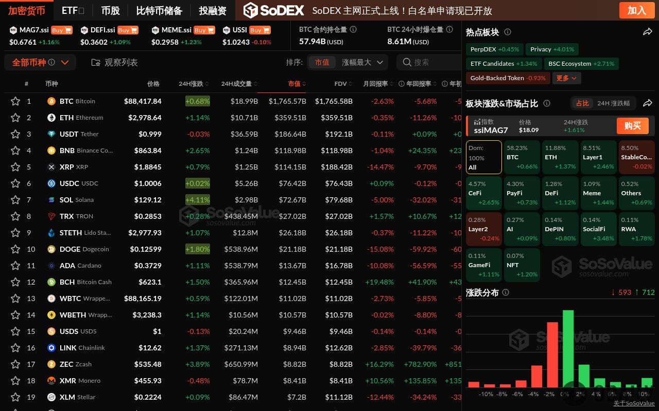反映板块历史行情的加密板块指数显示,ssiSocialFi、ssiCeFi、ssiLayer1 指数分别上涨 3.61%、2.51%、1.88%。