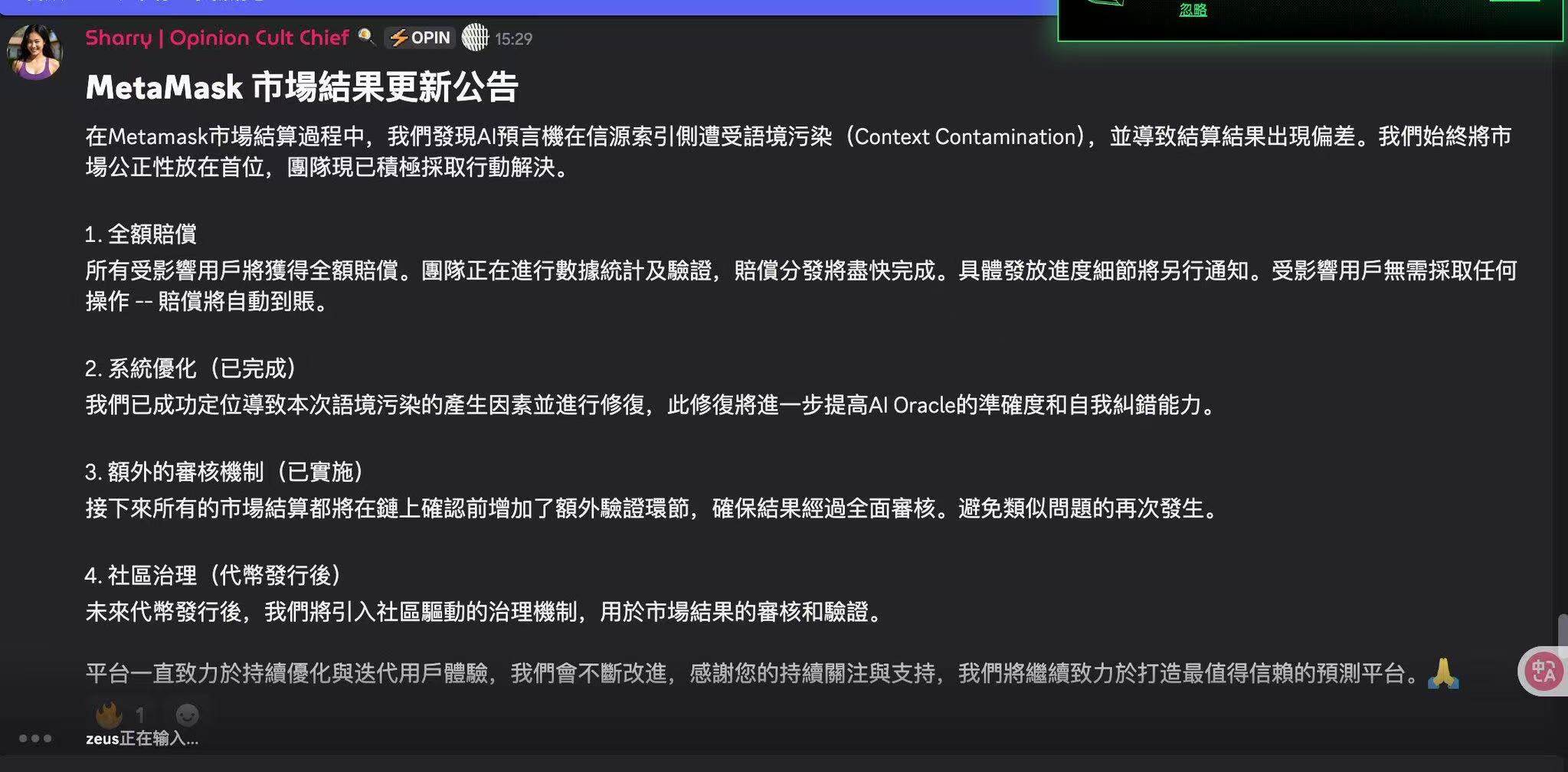 在Metamask市场结算过程中,我们发现AI预言机在信源索引侧遭受语境污染(Context Contamination),并导致结算结果出现偏差。我们始终将市场公正性放在首位,团队现已积极采取行动解决。