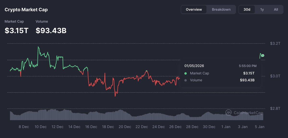 加密货币总市值上涨至3.12万亿美元,2026年开年上涨约5%