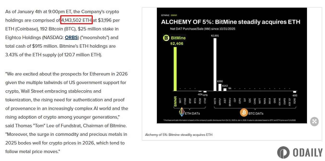 Odaily星球日报讯 据 Onchain Lens 监测,Bitmine (@BitMNR) 上周买入 32,977 枚 ETH,价值 1.04 亿美元。目前 Bitmine 共持有 4,143,502 枚 ETH,持仓总价值达 130.8 亿美元。