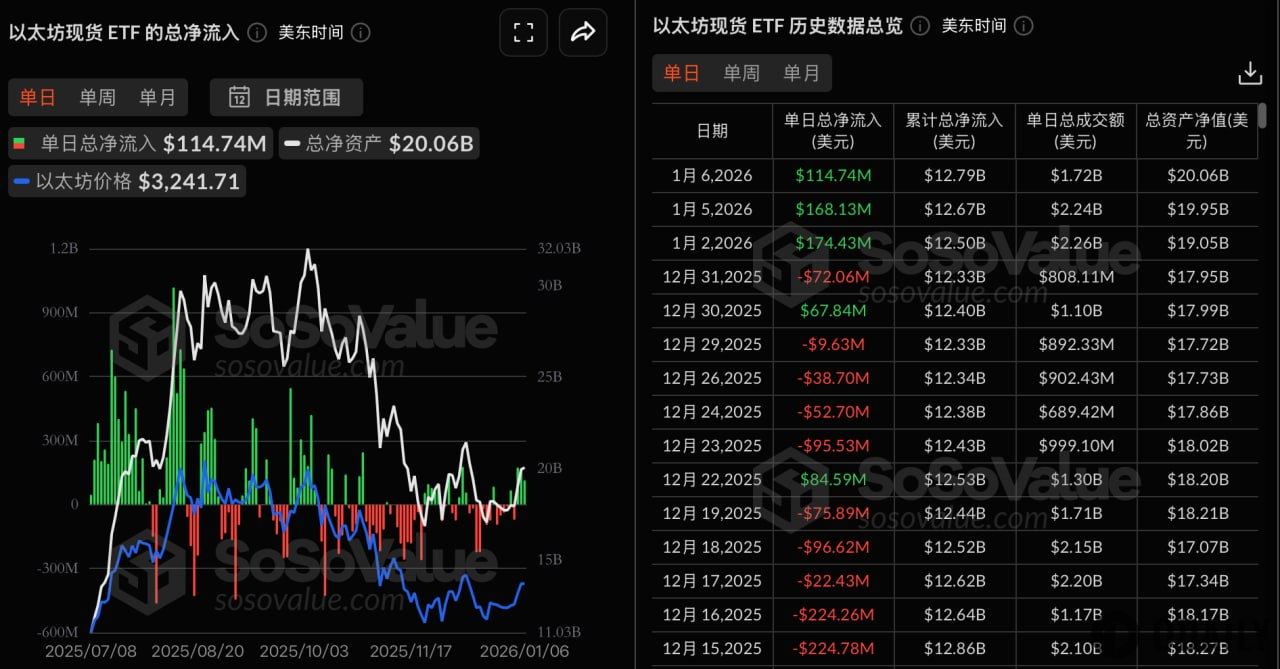 Odaily星球日报讯 根据 SoSoValue 数据,昨日(美东时间 1 月 6 日)以太坊现货 ETF 总净流入 1.15 亿美元。