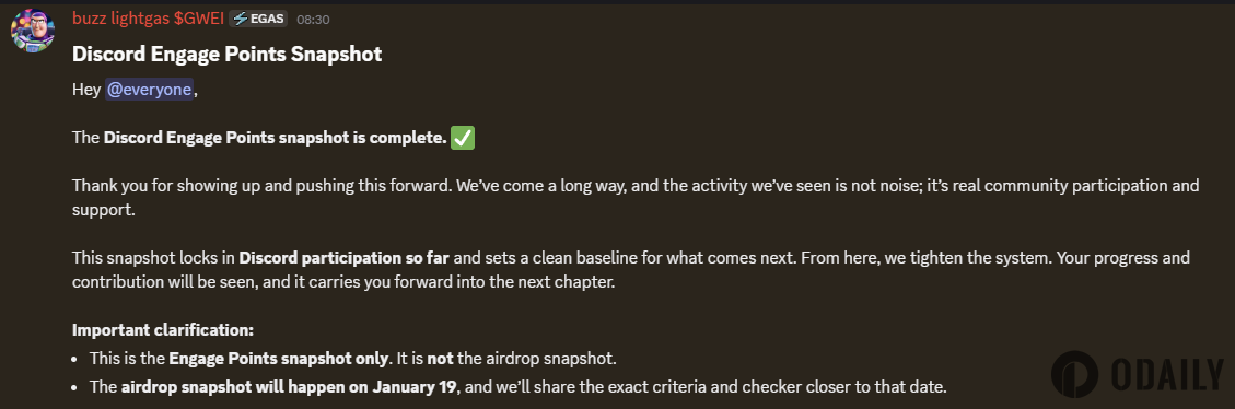 ETHGas:Discord互动积分快照已完成,代币空投快照将于1月19日进行