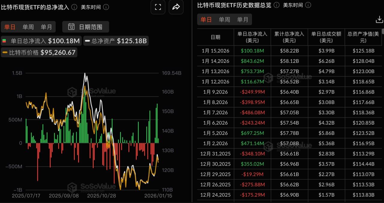 Odaily星球日报讯 根据 SoSoValue 数据,昨日(美东时间 1 月 15 日)比特币现货 ETF 总净流入 1.00 亿美元。