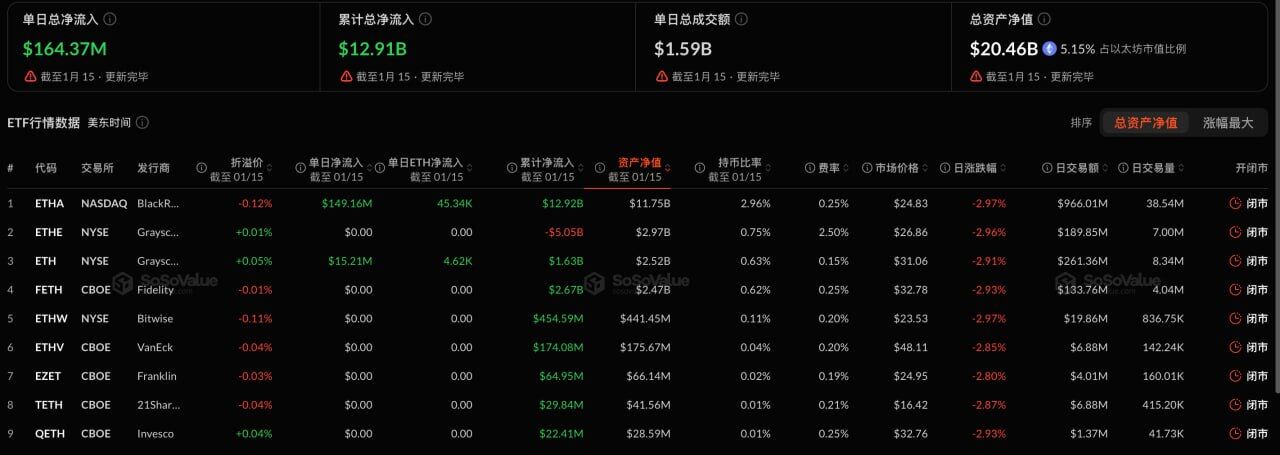 Odaily星球日报讯 根据 SoSoValue 数据,昨日(美东时间 1 月 15 日)以太坊现货 ETF 总净流入 1.64 亿美元。