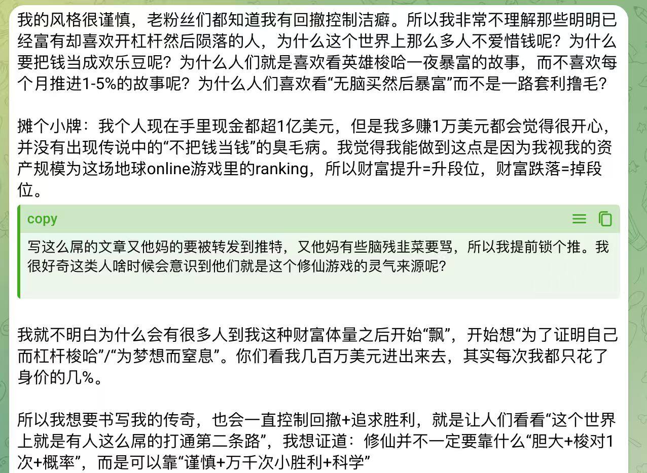 同时 Vida 表示,自己的资产管理风格以谨慎和回撤控制为核心,视资产规模为游戏排名,通过追求万千次小胜利和科学管理实现财富增长。Vida 指出,其单笔交易金额虽达数百万美元,但仅占其总身价的较小比例,并对高杠杆投机行为持否定态度。