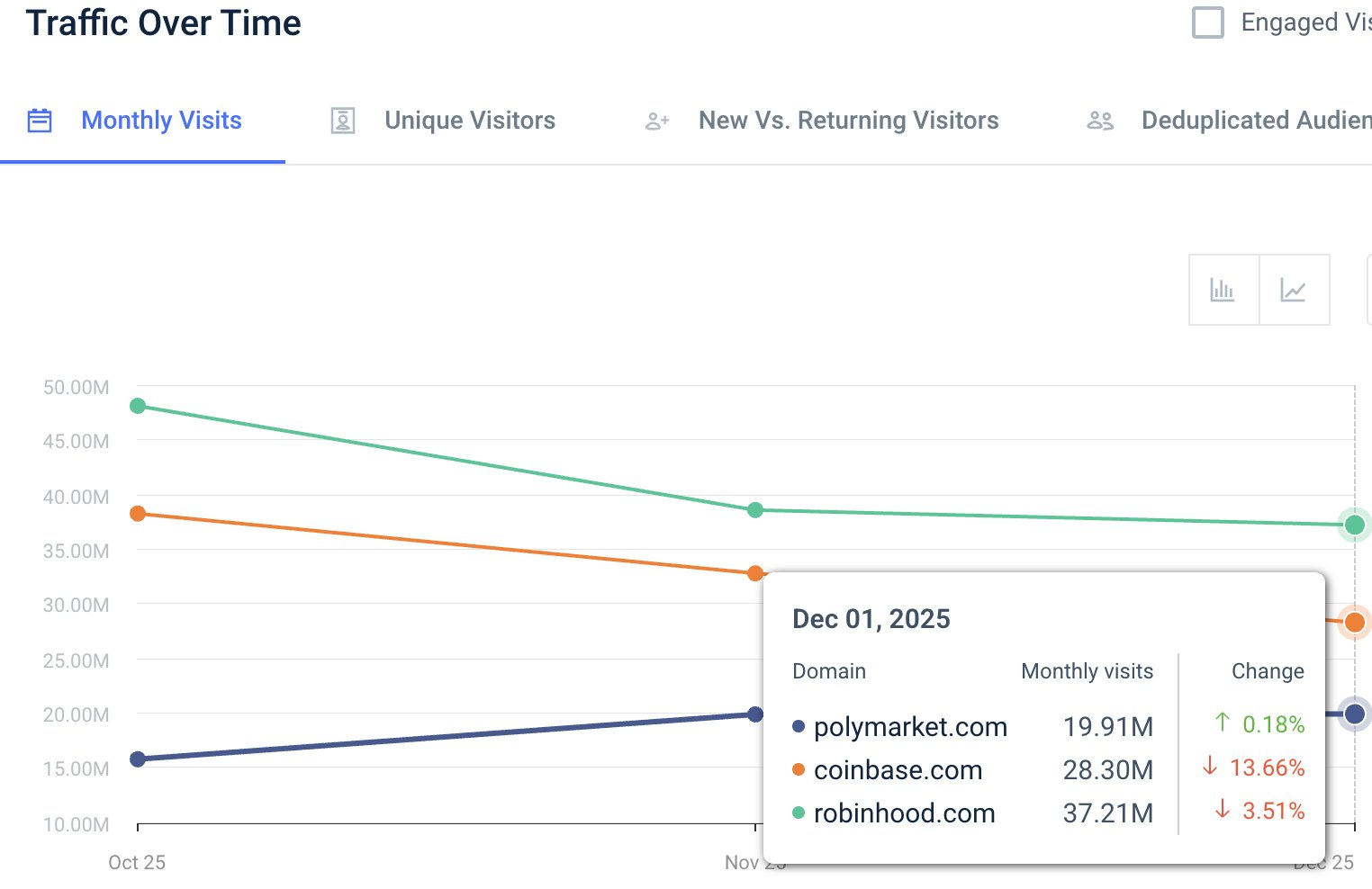 1confirmation创始人:Polymarket网站月度访问量持续攀升,Robinhood与Coinbase访问量呈下降趋势