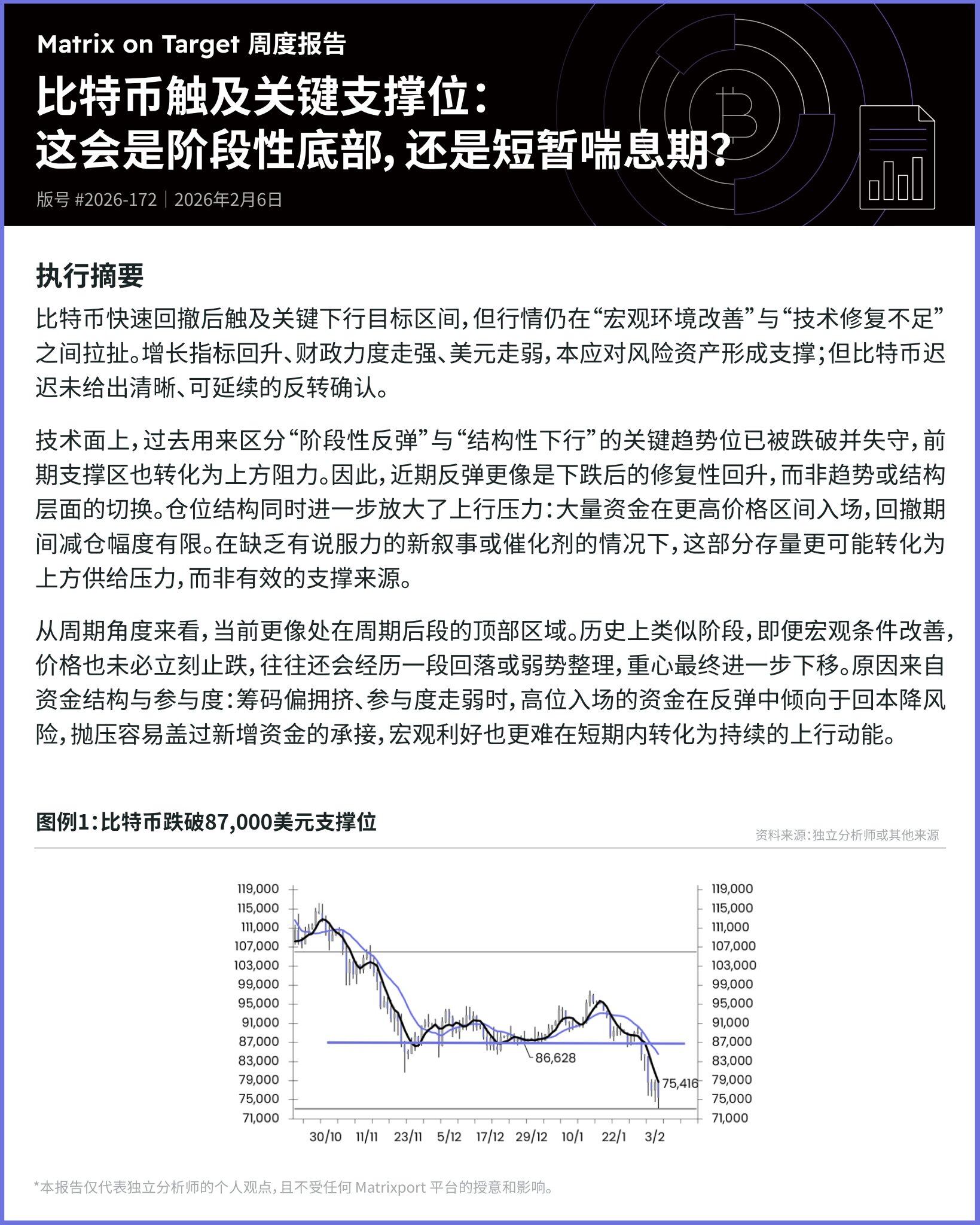 Odaily星球日报讯 Matrixport 发布周报表示,比特币快速回撤后触及关键下行目标区间,但行情仍在“宏观环境改善”与“技术修复不足”之间拉扯。增长指标回升,财政力度走强,美元走弱,本应对风险资产形成支撑;但比特币迟迟未给出清晰,可延续的反转确认。