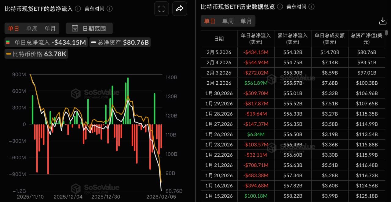 Odaily星球日报讯 根据 SoSoValue 数据,昨日(美东时间 2 月 5 日)比特币现货 ETF 总净流出 4.34 亿美元。