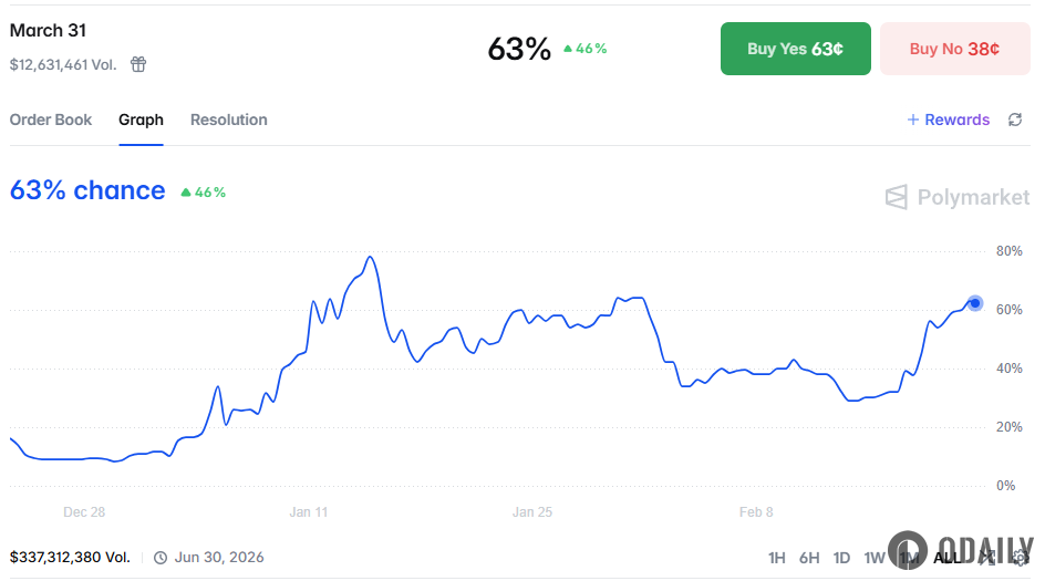 Polymarket上“美国在3月31日之前打击伊朗”事件概率升至63%