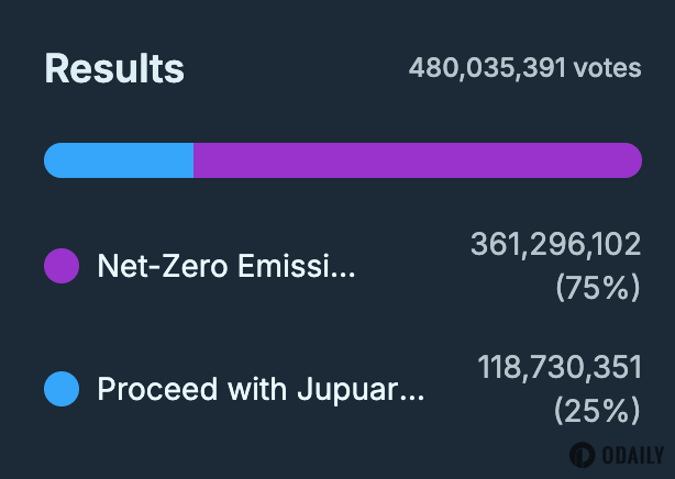 Odaily星球日报讯 Jupiter 关于“将未来代币净释放量降至零”的投票已于今日 19:00 正式结束,最终社区以 75% 的支持率通过了该提案。