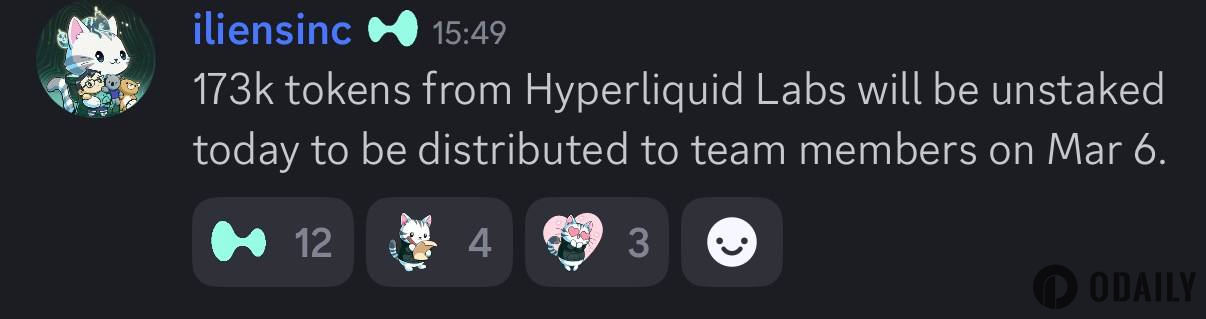 HyperLiquid联创:17.3万枚HYPE将解质押并于3月6日分配给团队成员
